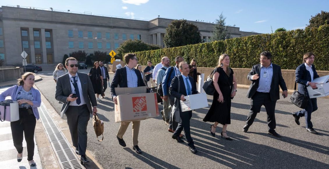 Muchos de los reporteros esperaron para salir juntos a las cuatro de la tarde, la hora límite establecida por el Departamento de Defensa para abandonar el edificio. A medida que se acercaba la hora, cajas de documentos se alineaban en un pasillo del Pentágono y los reporteros llevaban sillas, una fotocopiadora, libros y fotos antiguas hacia el estacionamiento desde sus espacios de trabajo. Poco después de las cuatro, entre 40 y 50 periodistas salieron del lugar tras entregar sus credenciales.