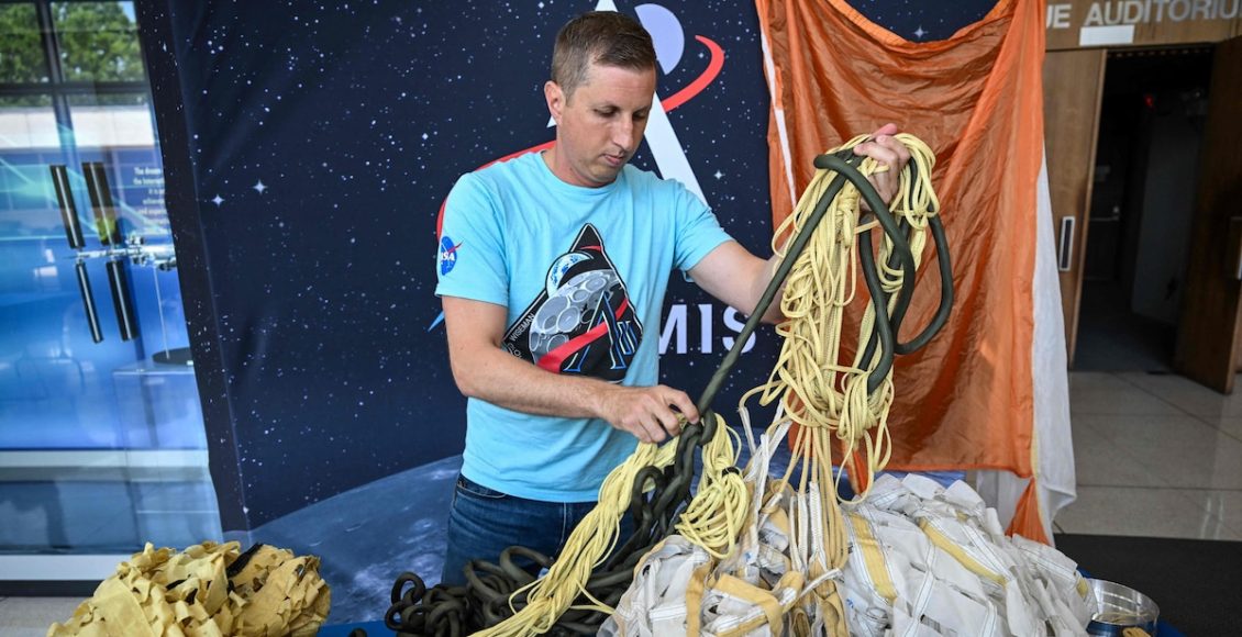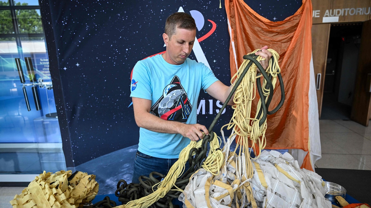 Jared Daum, ingeniero aeroespacial del Centro Espacial Johnson de la NASA, muestra el sistema de paracaídas de la nave OriónRONALDO SCHEMIDT – AFP