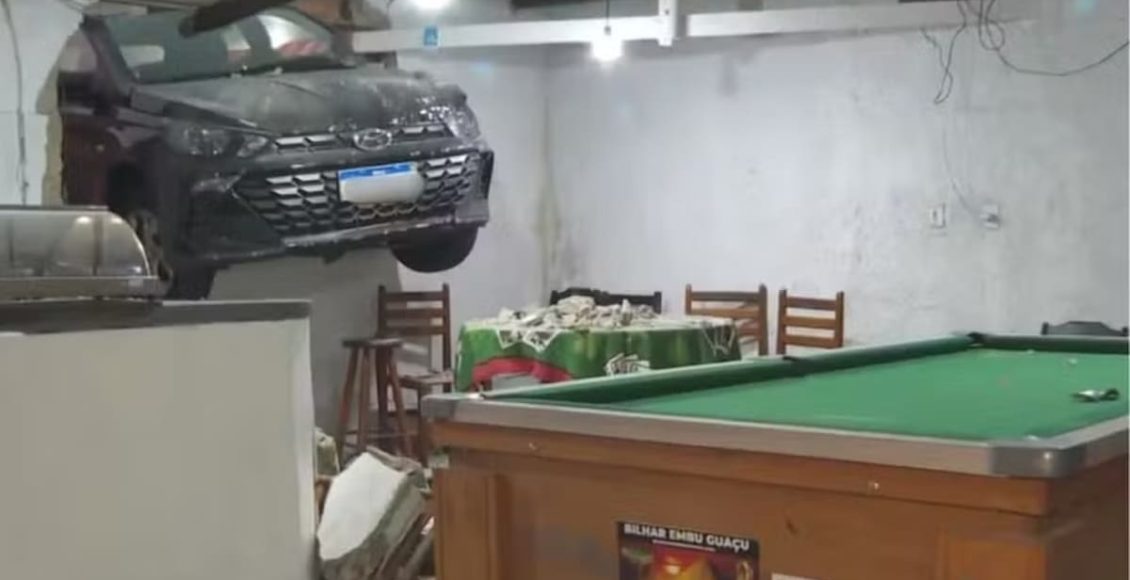 Un hombre quiso evitar un robo, atropelló a dos motochorros y su auto quedó incrustado en un bar en Brasil